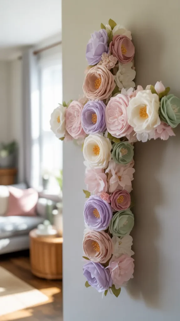 Use fabric flowers to create a textured cross wall piece. Choose soft spring colors for a gentle Easter vibe.