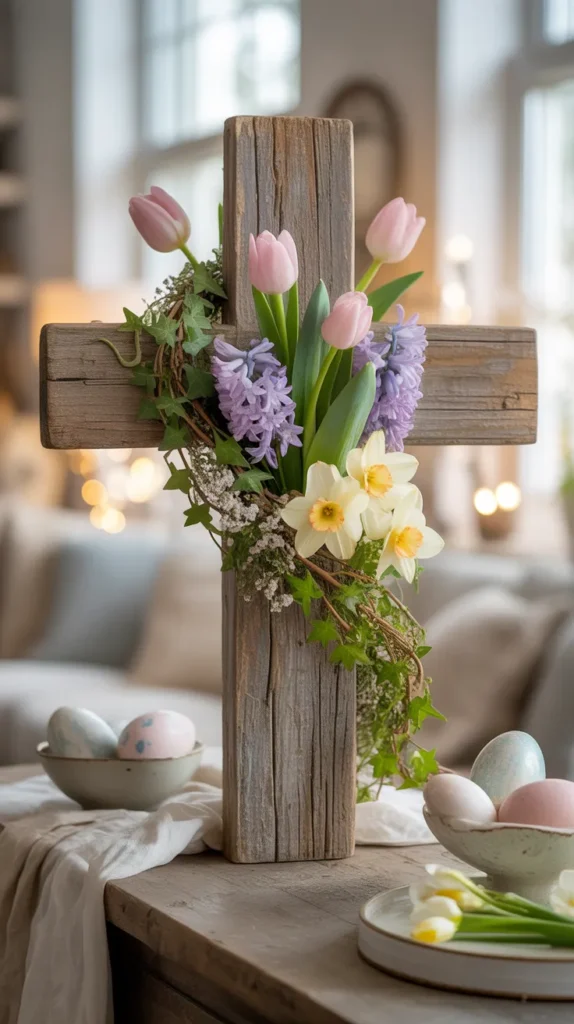 A floral wrapped wooden cross is a classic Easter decoration that never goes out of style. Start with a simple wood cross and wrap faux or fresh flowers around it using floral wire. Soft pastel blooms like tulips, daisies, or roses give a gentle spring feel that works well indoors or outdoors.