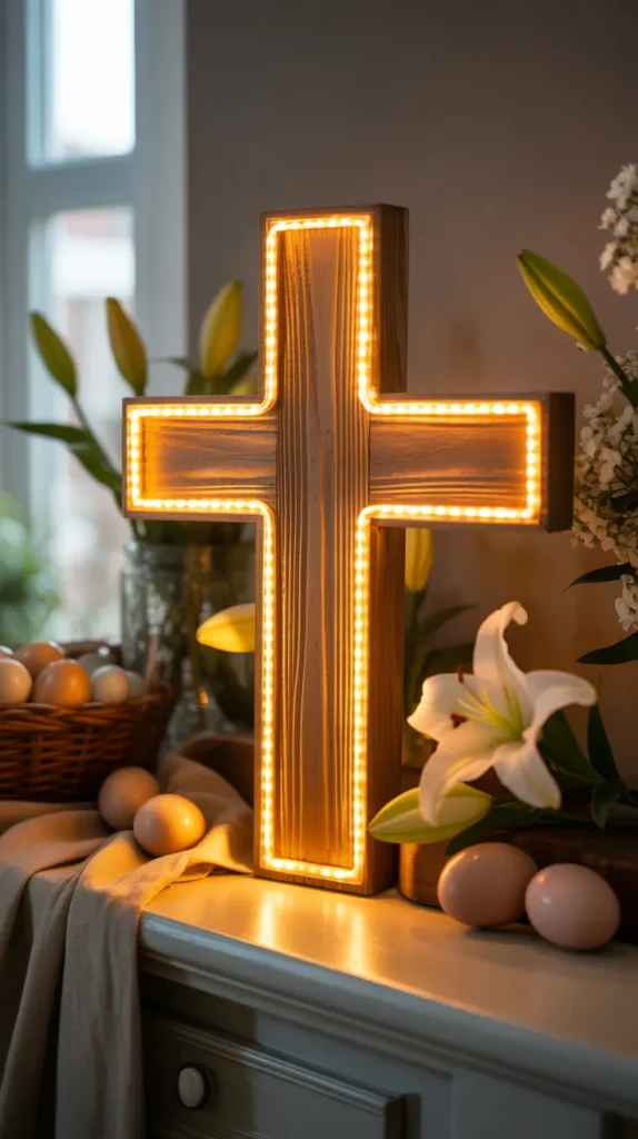 Outline a cross with soft LED lights for evening ambiance. Battery-powered lights keep it safe and flexible.