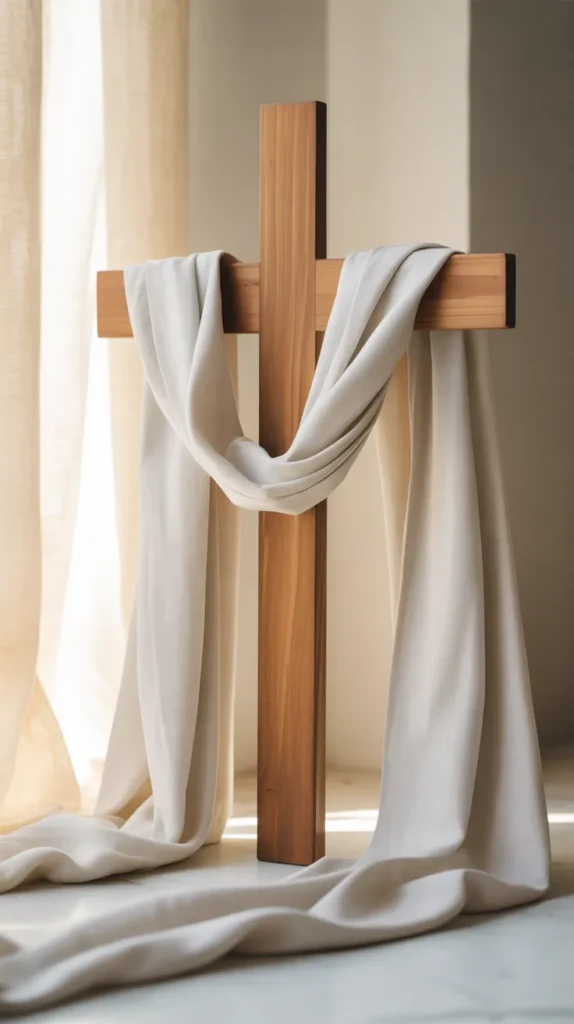 A white fabric draped cross represents purity and resurrection. Use lightweight cotton or chiffon fabric to softly drape across a wall-mounted or freestanding cross. This clean style fits modern homes and churches alike.