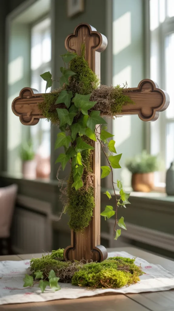 Create a natural garden-style cross using preserved moss and faux greenery. Attach moss sheets to a foam or wood base, then add eucalyptus or ivy for texture. This look feels fresh and earthy, perfect for spring displays.