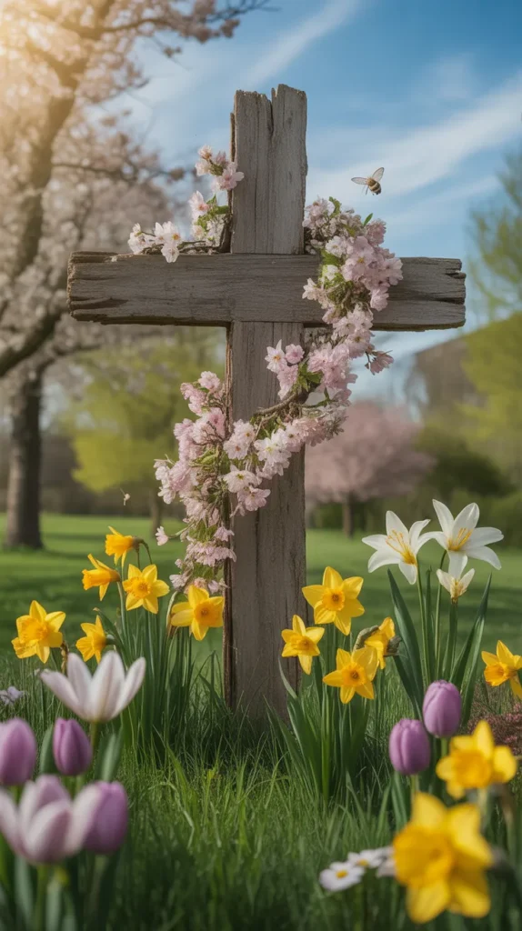 Place a weather-resistant cross in your garden surrounded by flowers or stones. It becomes a peaceful outdoor Easter focal point.