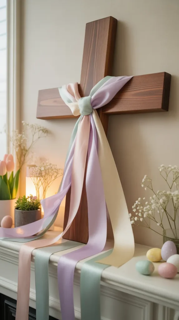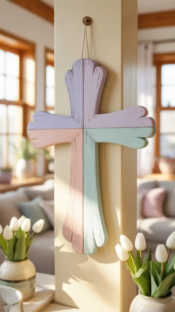 Paint a simple wall cross in soft Easter shades like blush pink, sage green, or sky blue. Light distressing adds charm and keeps the look relaxed and welcoming.