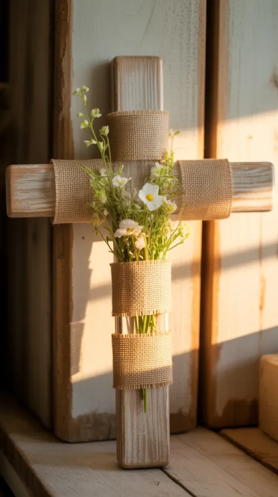 Wrap a wooden cross with burlap ribbon and add a small floral accent at the center. This rustic style works beautifully in farmhouse homes and church entryways.