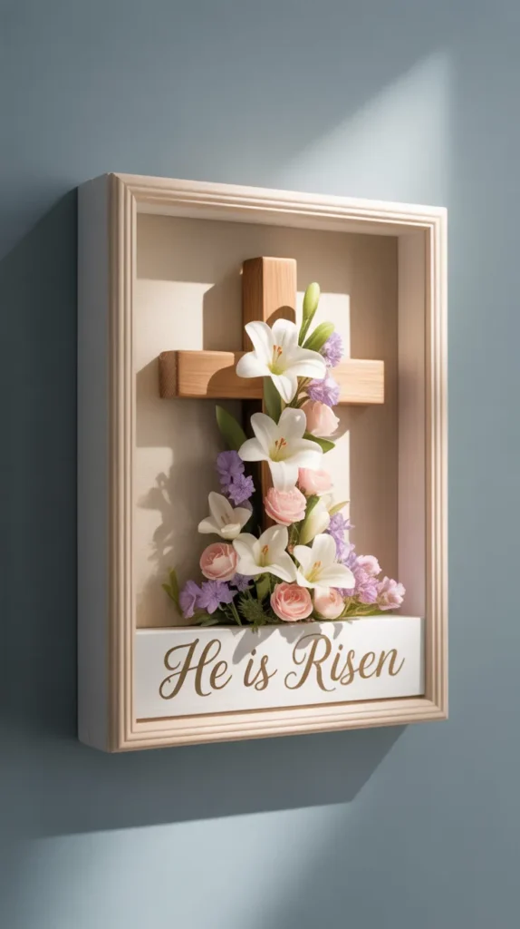 Create a framed cross using flowers, scripture, or fabric inside a shadow box. This style works well as wall art or a gift.