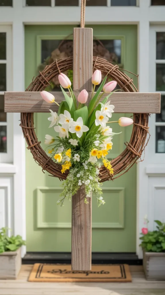 Combine a grapevine wreath with a wooden cross to create a beautiful layered look. Attach flowers or greenery where the wreath meets the cross for a soft focal point.