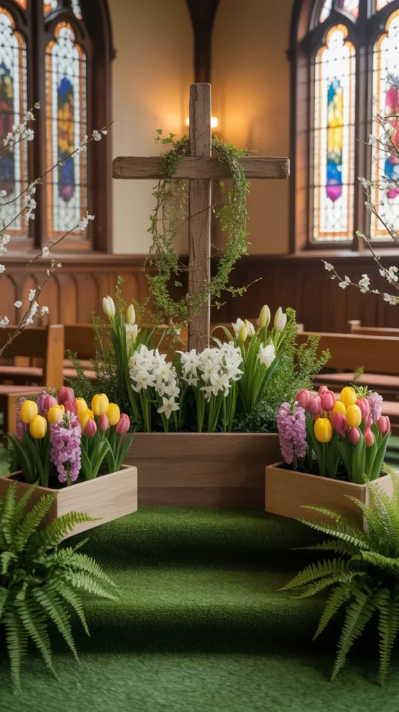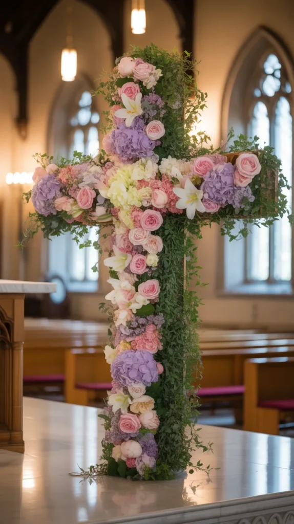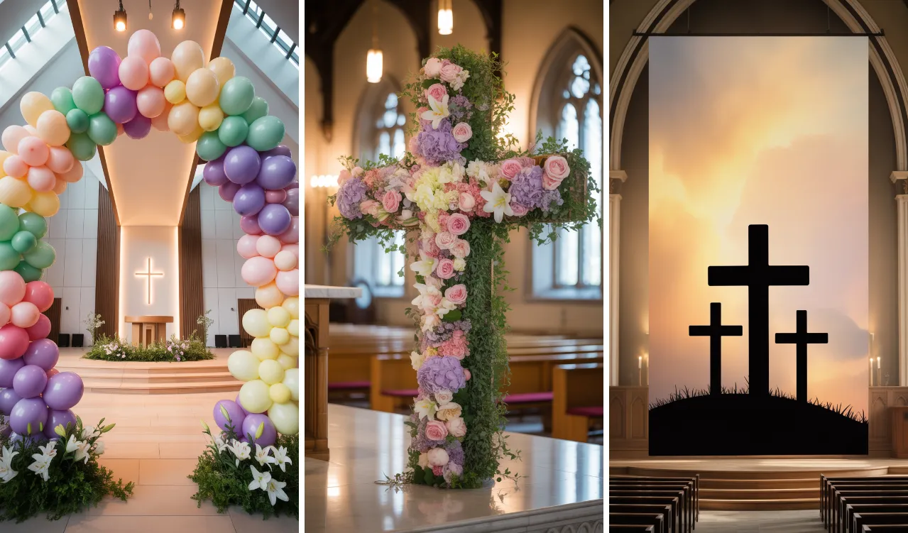 A floral cross brings freshness and color to your Easter church stage decoration. Cover a wooden or foam cross with artificial spring flowers in pastel shades like pink, lavender, yellow, and white. Add greenery for depth and texture.