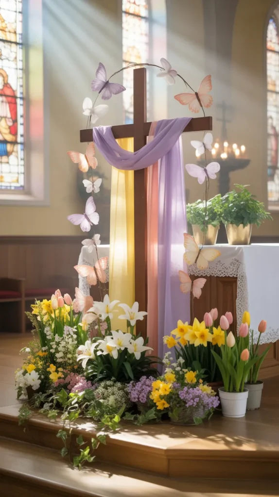 Butterflies symbolize transformation and new life. Add large butterfly cutouts around the cross or backdrop for a creative Easter stage setup.