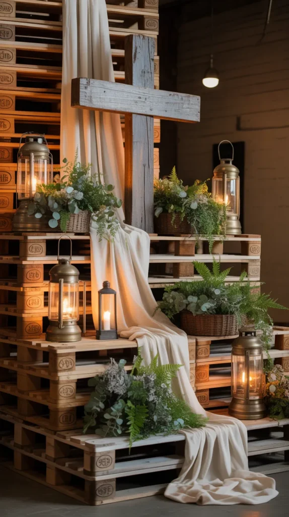 Use wooden pallets, lanterns, and neutral fabrics for a rustic farmhouse Easter stage. Add a simple wooden cross and greenery for a warm feel.