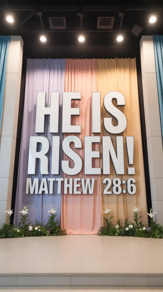 Display a key Easter Bible verse in large, bold letters across the stage backdrop. Use vinyl lettering or printed banners for a clean look.