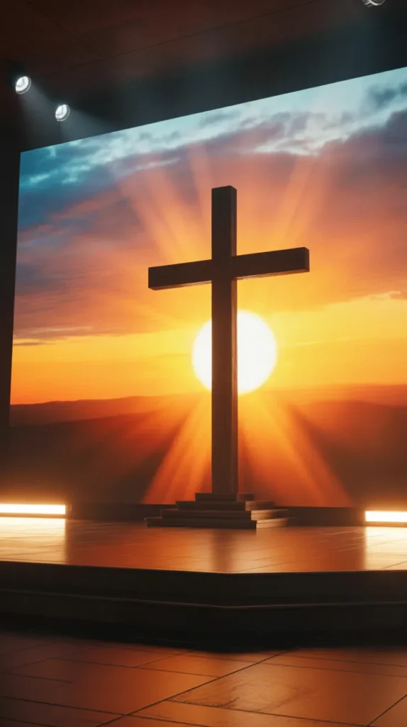 A sunrise backdrop symbolizes new beginnings and hope. You can paint a large canvas or print a scenic sunrise image as your church stage background. Place the cross silhouette in front of the sunrise for added impact.
