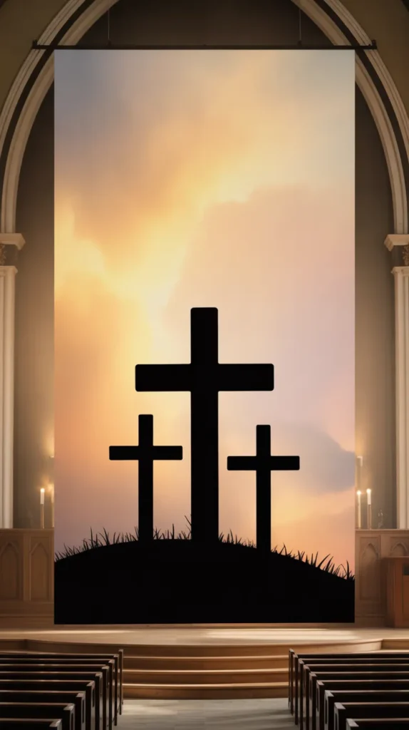 Create a backdrop featuring three crosses on a hill to reflect the Good Friday and Easter story. Use black silhouettes against a soft sky background for dramatic effect.