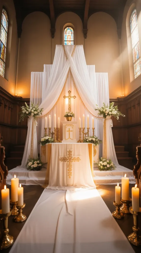 White and gold is a classic color combination for Easter church decor ideas. Use white curtains as the main background and add gold accents through vases, candle holders, or decorative frames. Soft white lights enhance the clean look.