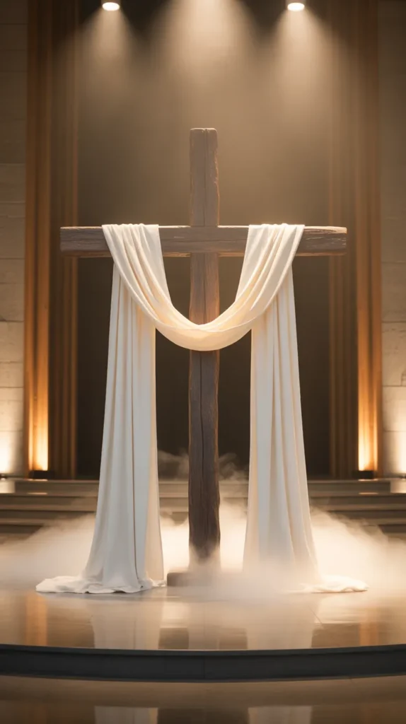 You can keep costs low by using plywood or reclaimed wood for the cross. White fabric from local craft stores or budget retailers makes this a smart purchase for churches looking to save money. This design is simple, affordable, and powerful without requiring expensive props.