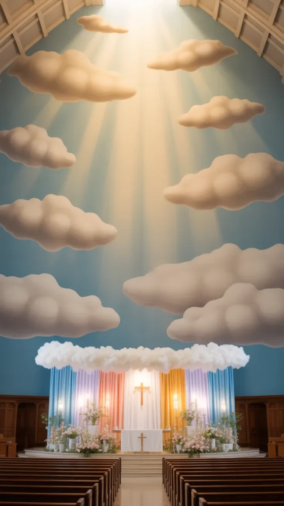Create a soft cloud backdrop using cotton batting or printed sky banners. Add cool white lighting to give a heavenly glow.