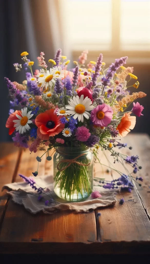Bring the beauty of spring indoors with a floral centerpiece made from wildflowers or inexpensive grocery store blooms.