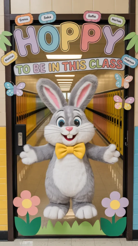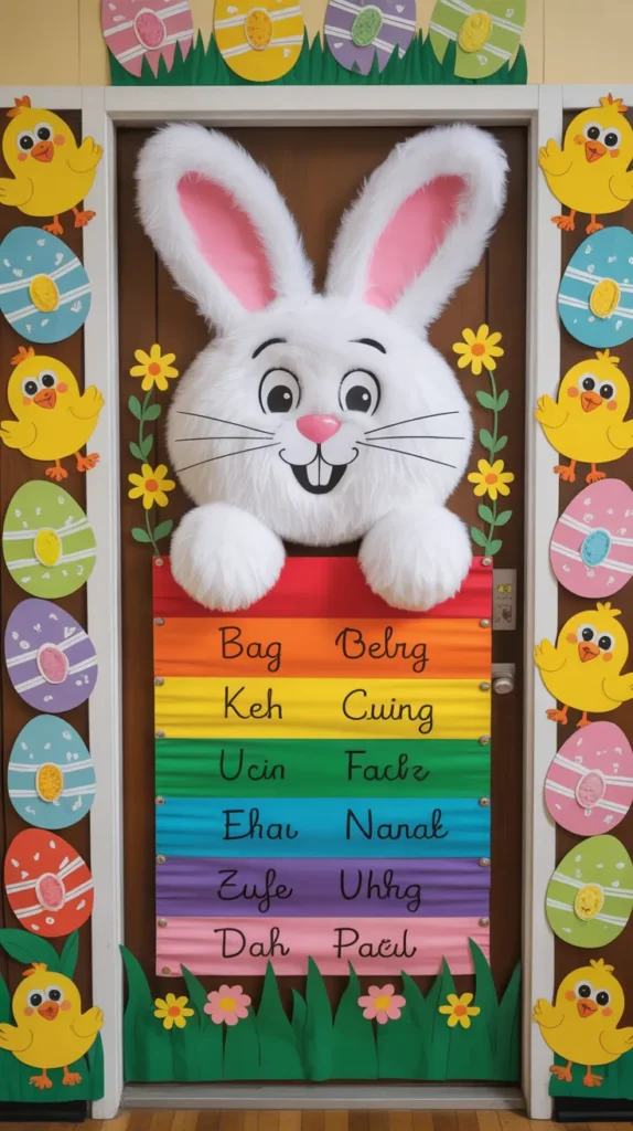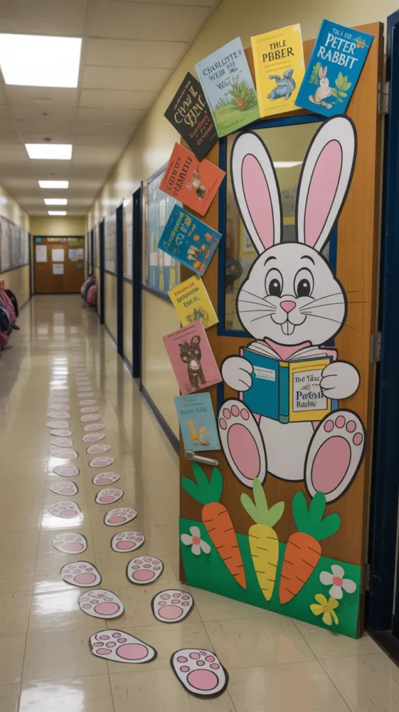 Combine Easter fun with reading goals by adding bunny footprints leading to book covers or favorite story titles. A large bunny cutout can welcome students at the door while promoting literacy.