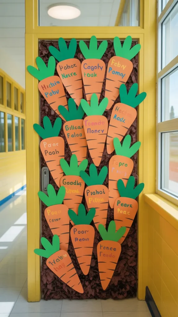 Transform your door into a carrot garden with green tissue paper tops and orange paper carrots. Write student names or kind messages on each carrot to make the display personal and engaging.
