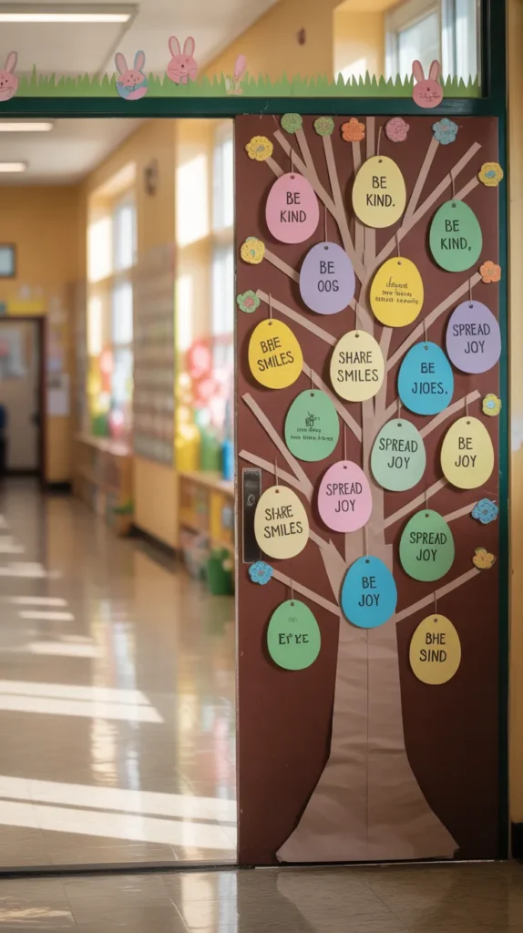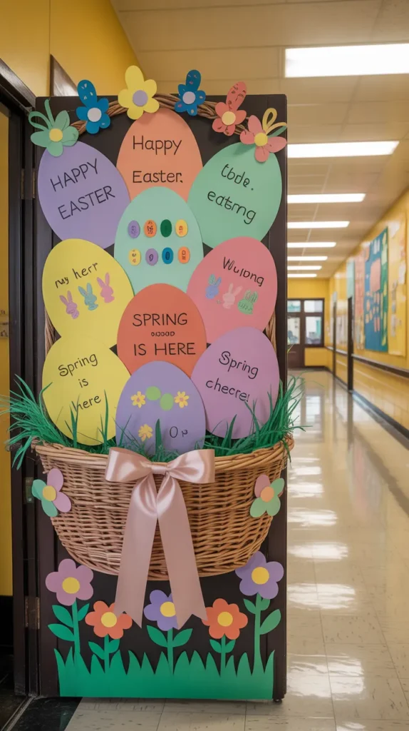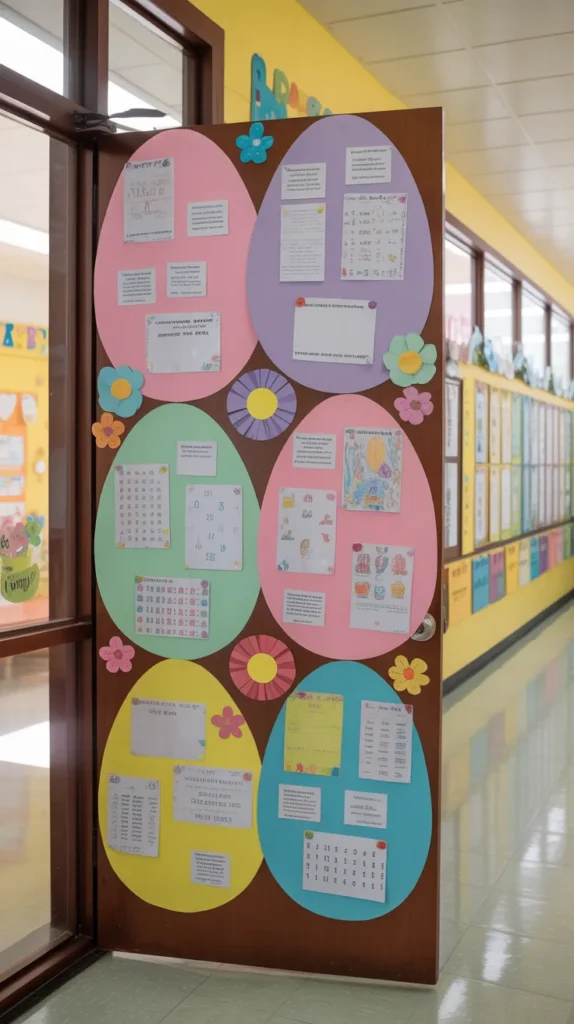 Turn your classroom door into a giant Easter egg board filled with mini eggs that show math facts, spelling words, or positive quotes. Each egg can represent a student’s work, creating a learning-based Easter display that feels fun and purposeful.