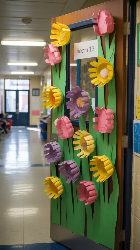 Use recycled egg cartons painted in bright colors to form flowers or Easter eggs on your door. This eco-friendly project teaches students about reuse while creating eye-catching decor.