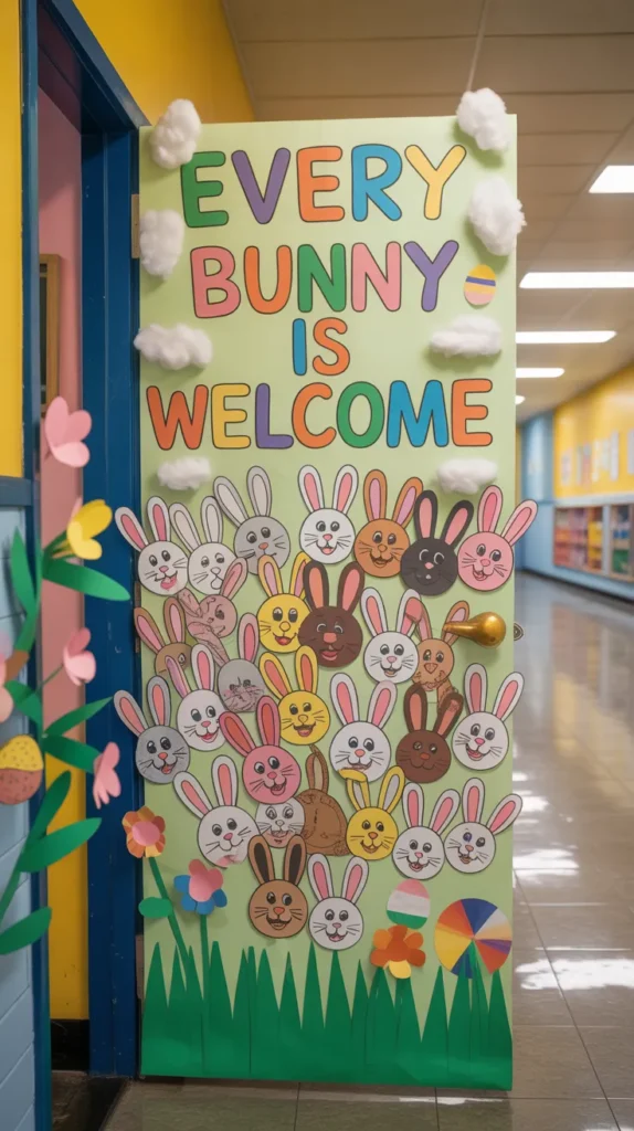 This inclusive Easter door design features smiling bunnies in different colors, shapes, and sizes. Add a big center message like “Every Bunny Is Welcome” with pastel paper clouds and grass borders. Each student can decorate their own bunny face and help build the display, making it interactive and meaningful.