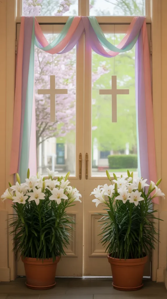 For schools that celebrate faith-based holidays, create a peaceful Easter door with crosses, lilies, and uplifting messages. Soft colors and simple designs keep the look respectful and warm.