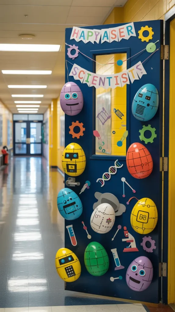 Turn eggs into robots or science tools for a STEM-inspired Easter door. Add gears, numbers, and creative labels.