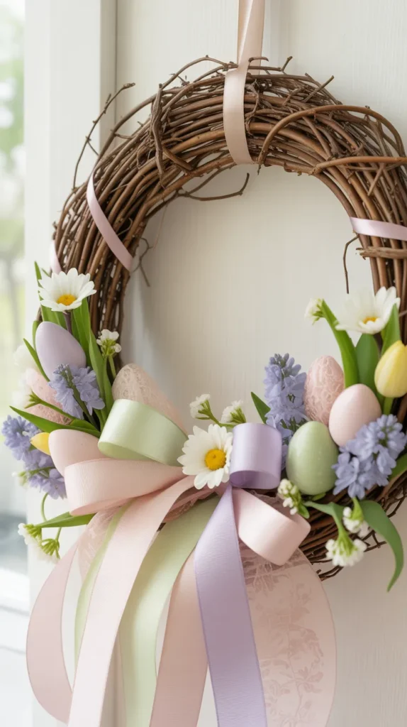 Layer pastel ribbons around your grapevine wreath for added texture and color. Mix satin, lace, and soft cotton ribbons for visual interest.