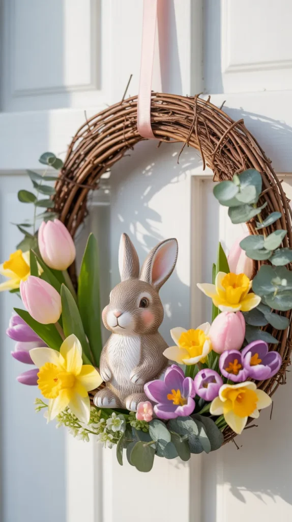Adding a small bunny figure to your grapevine wreath creates a playful Easter vibe without looking childish. Nestle a neutral-toned bunny into one side of the wreath and surround it with greenery and soft florals.