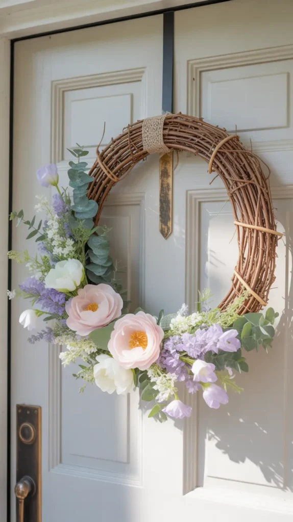 A classic pastel floral grapevine wreath is always a favorite for Easter front door decor. Start with a natural grapevine base and add soft-colored faux flowers like tulips, daisies, or peonies. Light pink, lavender, yellow, and mint green create a gentle spring look that feels welcoming and timeless.