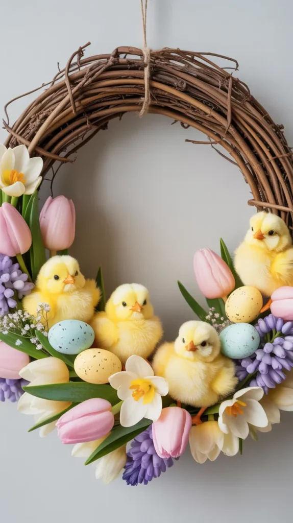 Add tiny chick accents for a playful family-friendly wreath. Keep colors soft to avoid overpowering the design.