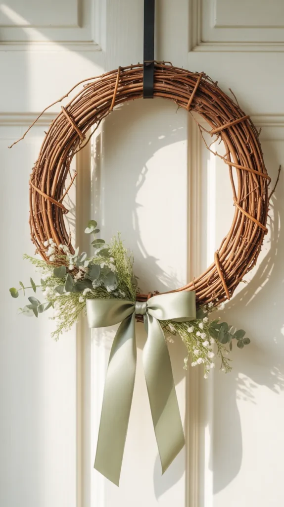 For a modern look, try a greenery-only grapevine wreath using eucalyptus, boxwood, or lamb’s ear. This clean style fits farmhouse, modern, and minimalist homes.