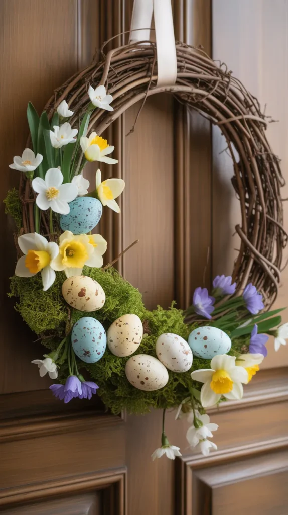 Decorative speckled eggs tucked into a grapevine wreath bring classic Easter charm. Add moss and tiny flowers to complete the look.