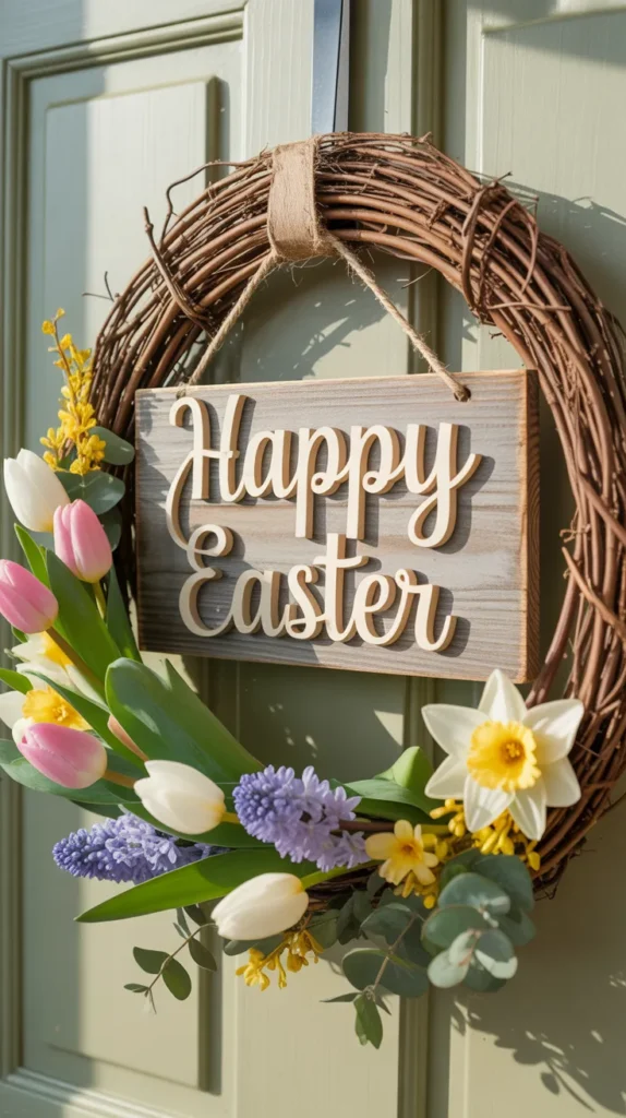 Attach a small wooden “Happy Easter” sign to the center or bottom of your wreath. Add simple florals or greenery for balance.