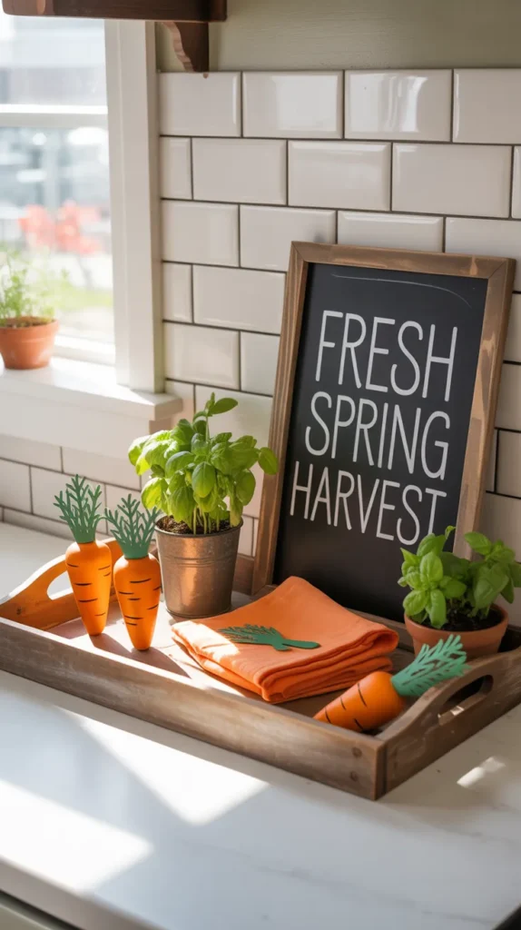 Use carrot decor, greenery, orange napkins, and a chalkboard sign for playful kitchen styling.
