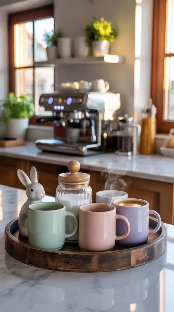 Decorate your coffee station with Easter mugs, bunny figurines, and pastel jars.