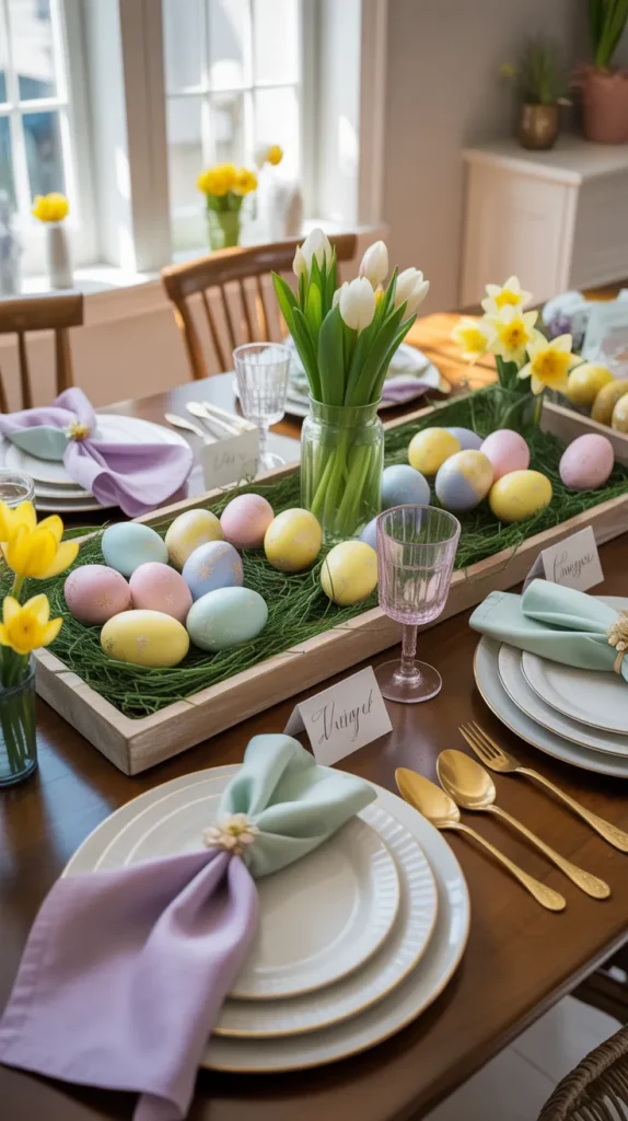 Style a large tray with pastel napkins, ceramic plates, decorative eggs, and fresh flowers for Easter brunch. Add handwritten place cards for charm.