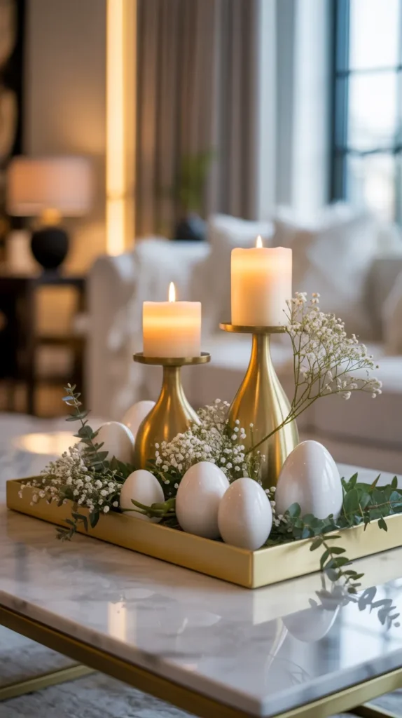 Gold candle holders, white eggs, and greenery create classy spring decor without high cost.