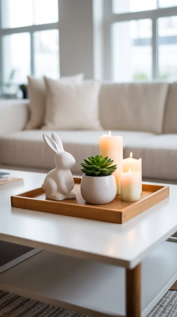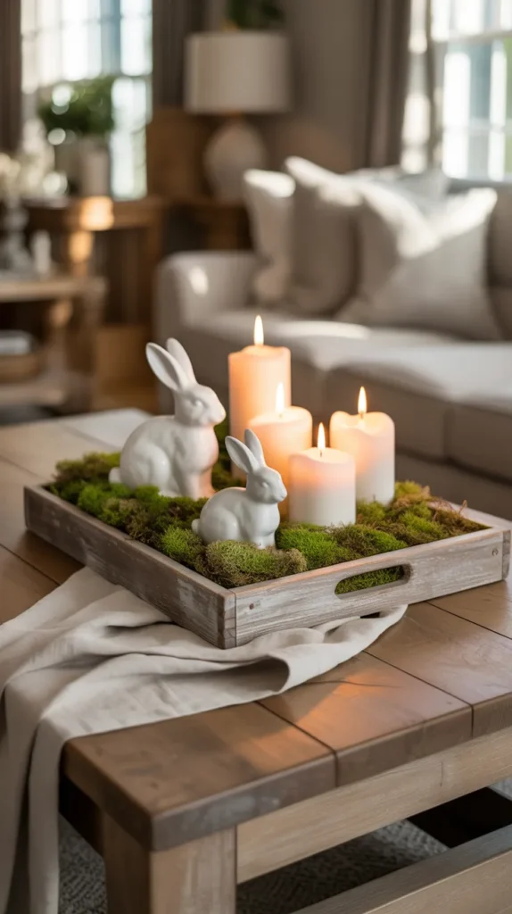 Create a cozy farmhouse look using a wooden tray, natural moss, ceramic bunny figurines, and soft neutral candles. Add burlap or linen fabric at the base for texture. This style works beautifully on coffee tables or entry consoles.