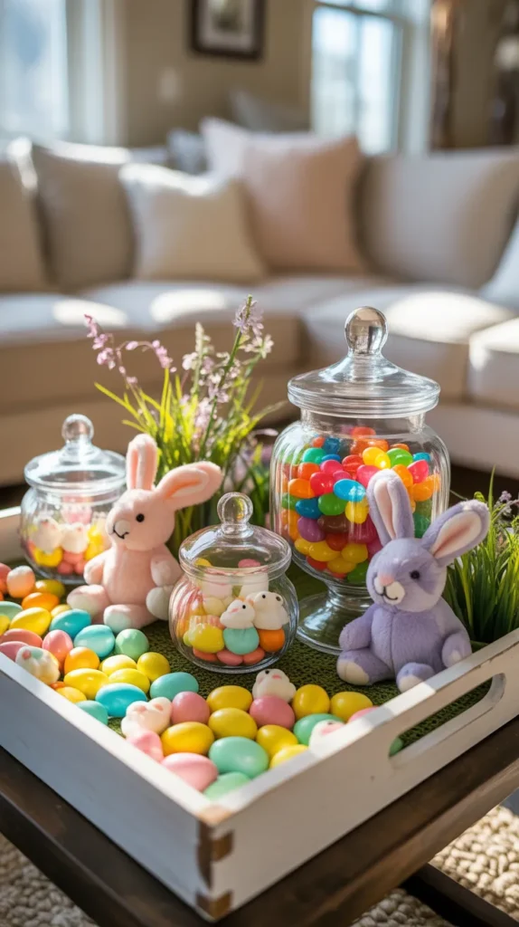 Fill jars with candy, pastel eggs, and bunny toys for family rooms.