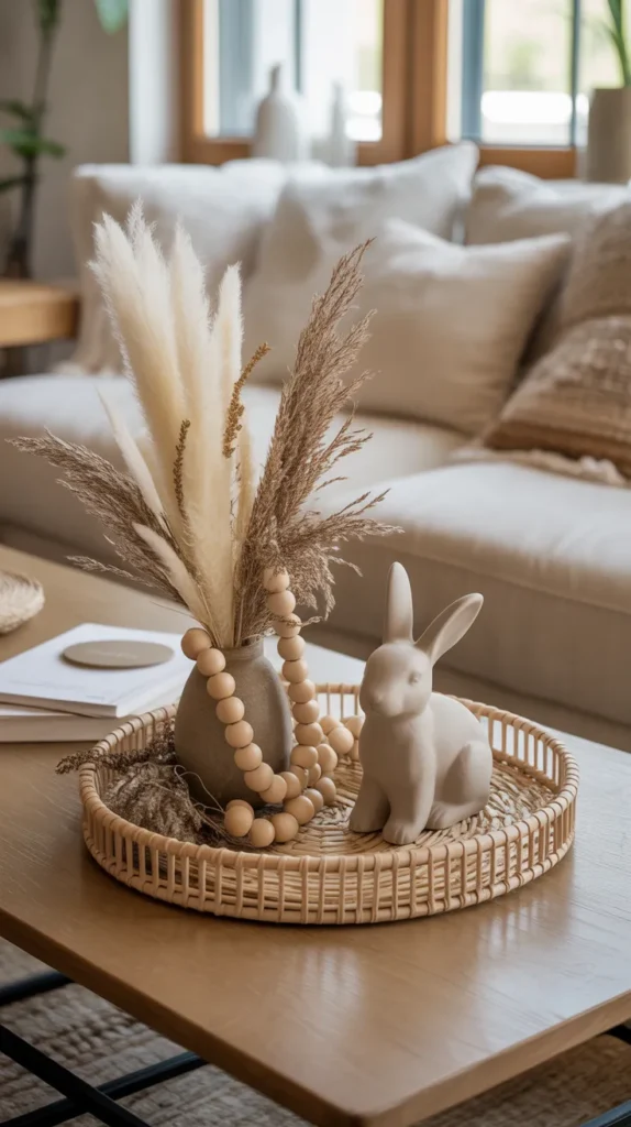 Use rattan trays, dried florals, wooden beads, and neutral bunnies for boho charm.