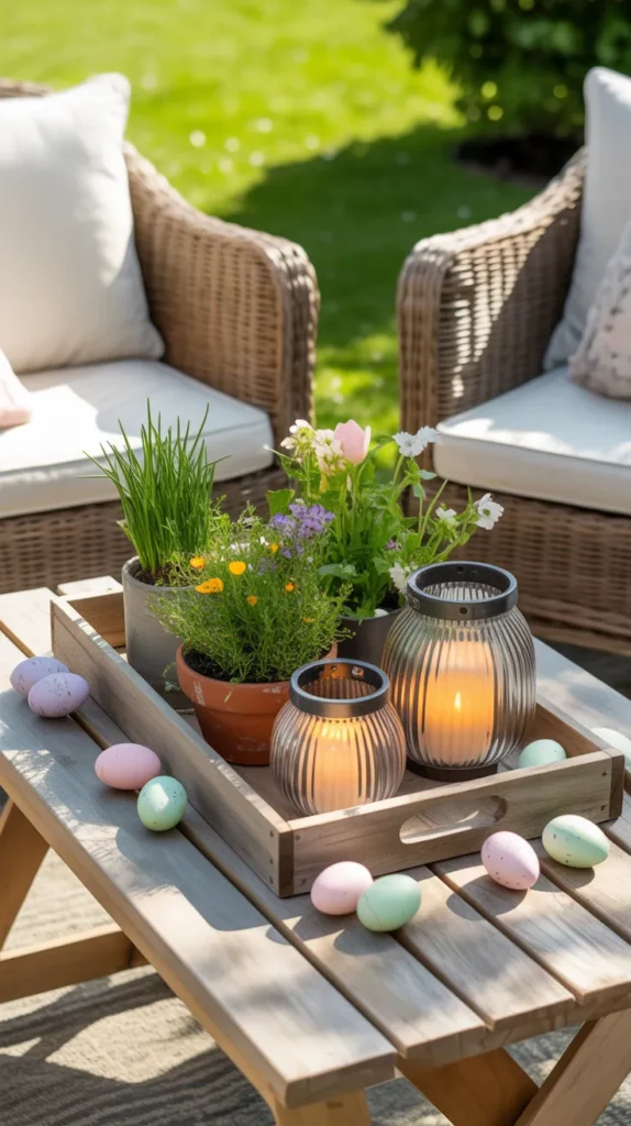 Use lanterns, plants, and eggs on patio trays for outdoor Easter charm.