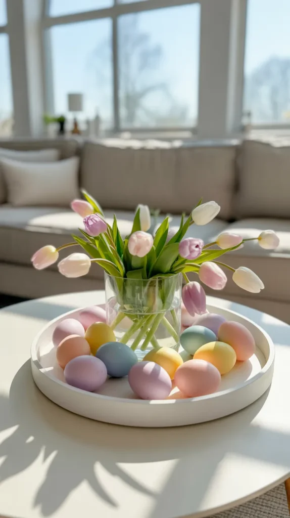 Use pastel eggs, faux florals, and a glass vase with tulips on a round tray for cheerful spring vibes. Soft pinks, blues, and yellows brighten any living space instantly.