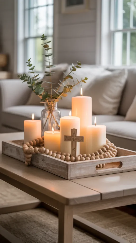 Combine wooden bead garlands, a small decorative cross, greenery, and candles in a wooden tray for peaceful Easter styling. This design feels meaningful and calming.
