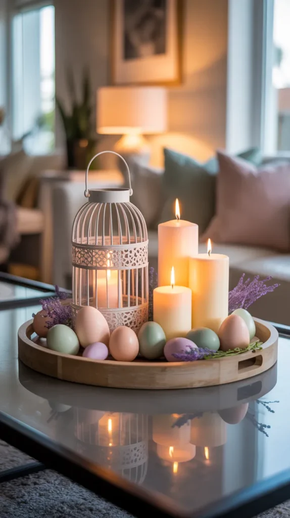 Add a lantern, candles, and pastel eggs for warm evening glow. Perfect for living rooms or dining tables.
