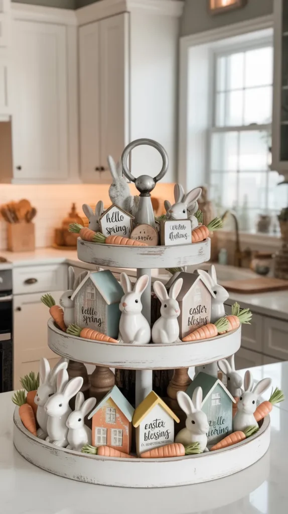 Build a mini Easter village using bunny figures, tiny houses, carrots, and small spring signs on a tiered tray. Perfect for kitchen counters or breakfast areas.