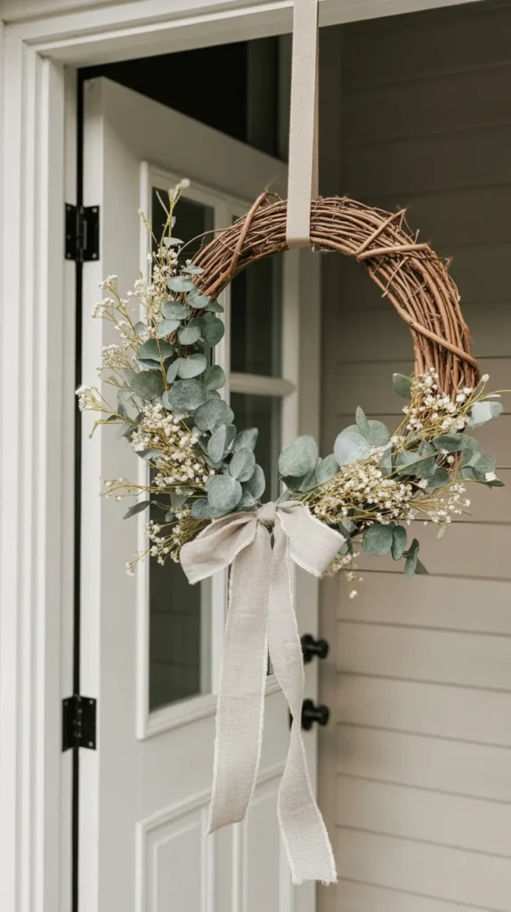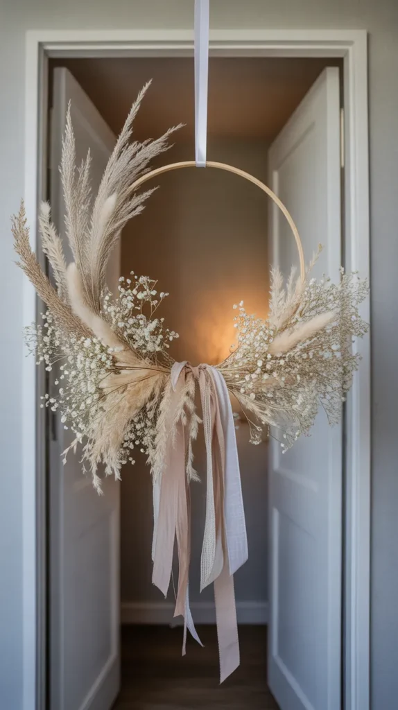 Finish with a boho-inspired wreath using baby’s breath, dried-look stems, and flowing neutral ribbons. Keep the color palette soft with cream, beige, and blush tones. This design feels trendy while staying affordable by using fewer flowers and more ribbon texture.