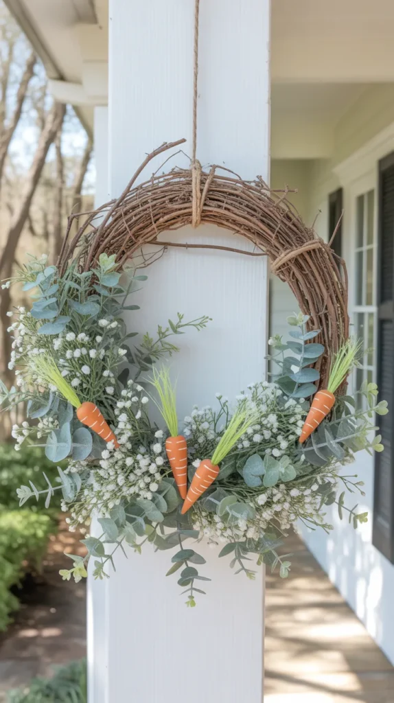 Add small faux carrots between baby’s breath clusters for a playful Easter twist. Keep the base simple with grapevine and light greenery so the carrots stand out. This wreath is fun without being overdone.