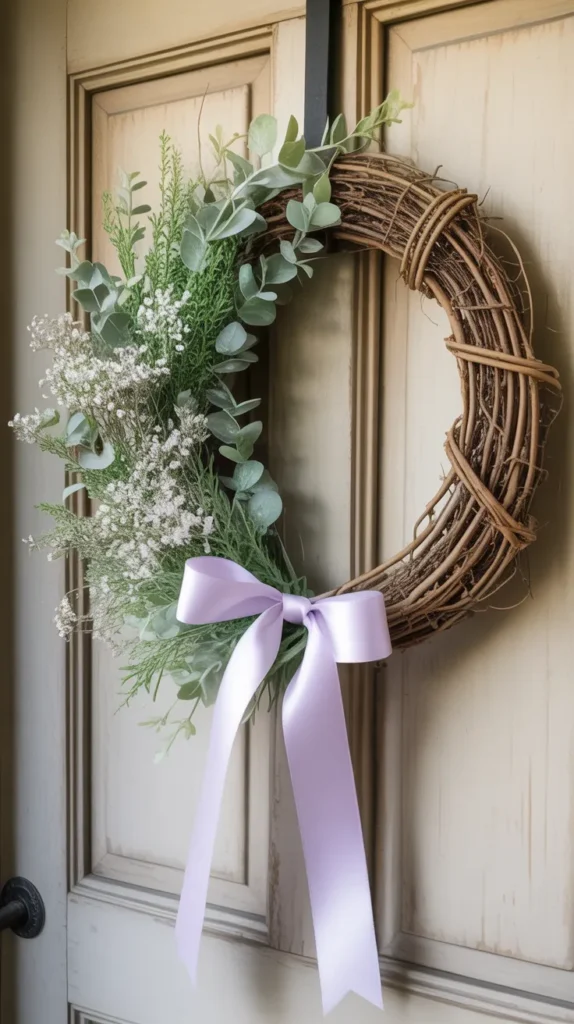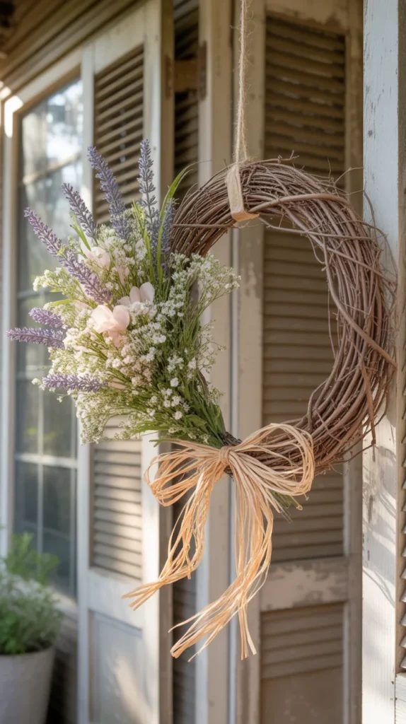 Combine baby’s breath with faux lavender for a calm, rustic Easter wreath. Add a twine bow or small wooden cross for a gentle seasonal touch. This design works beautifully for farmhouse porches and quiet entryways.