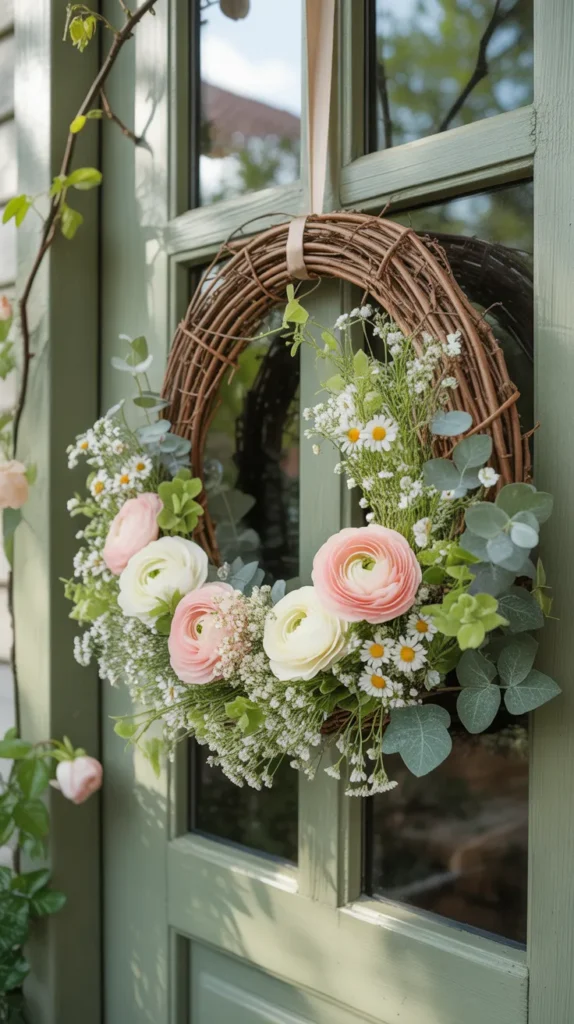 Mix baby’s breath with small pastel Easter eggs for a playful spring wreath. Place lightweight eggs between flower clusters and greenery for pops of color. This design is great for homes with kids or anyone who enjoys cheerful seasonal decor.